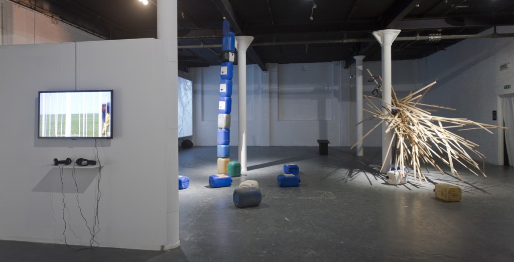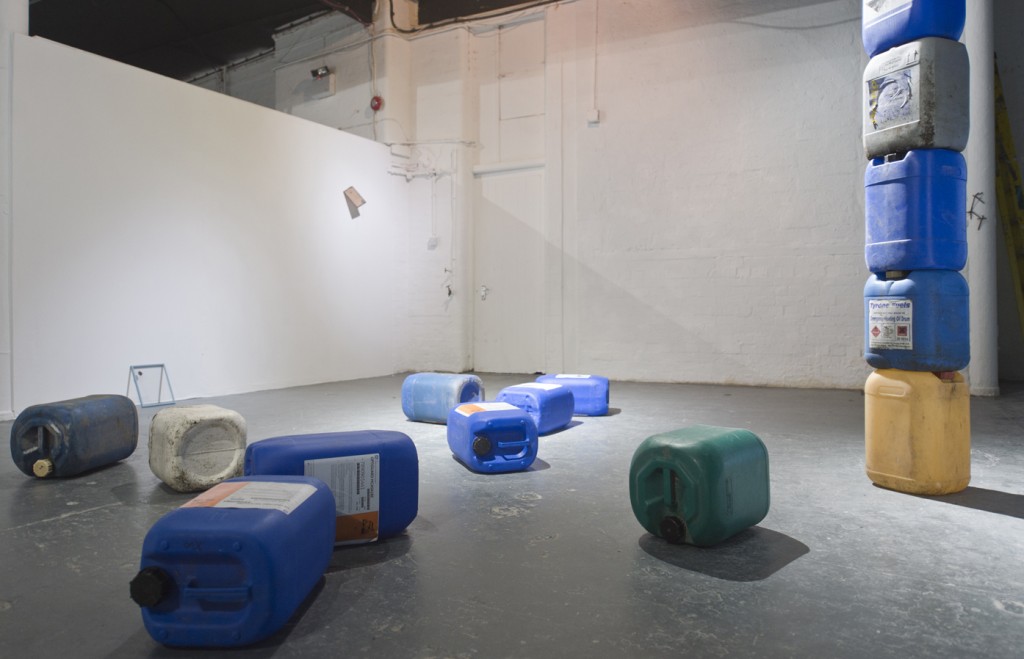 Gravity and balance informed a somewhat granier, rustical addition of material elements on top of each other. Two free standing columns of oil drums sore up four metres as if in support of the gallery’s ceiling.