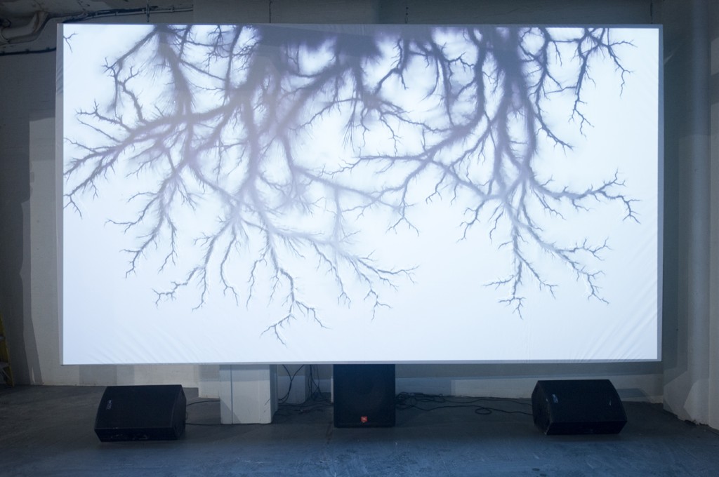Gracefully avoided and replaced by the visual, the exhibition offers two modes, one with the image animated and sound added (Thorsten Fleisch) the other with the image forged in real time in front of our eyes in an installation with the sound integrally produced by it and manipulated by the artist.